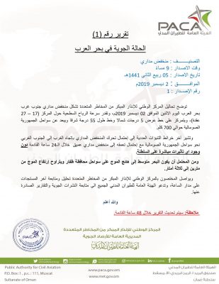الهيئة العامة للطيران المدني تصدر تقرير رقم ١ عن الحالة الجوية في بحر العرب.