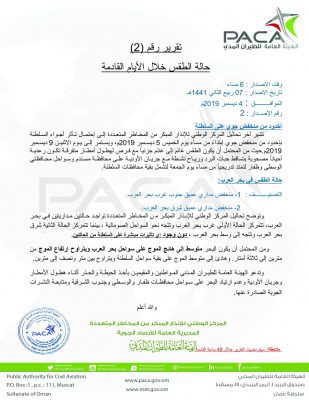 أصدرت الهيئة العامة للطيران المدني تصدر تقرير رقم ٢ عن الحالة الجوية في بحر العرب والتي من المتوقع أن يبدأ تأثيرها يوم الخميس ٥ ديسمبر ٢٠١٩ وتستمر حتى يوم الاثنين ٩ ديسمبر ٢٠١٩م.
