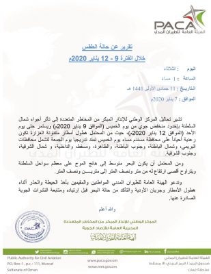 الهيئة العامة للطيران المدني : تحاليل المركز الوطني للإنذار المبكر من المخاطر المتعددة تشير إلى تأثر أجواء شمال السلطنة بإخدود منخفض جوي اعتبارًا من يوم الخميس الموافق 9 يناير ويستمر حتى يوم الأحد الموافق 12 يناير 2020م