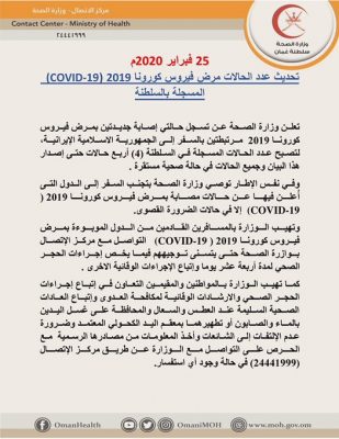قالت وزارة الصحة ان تم تسجيل إصابتين جديدتين بمرض فيروس كورونا في السلطنة مرتبطتين بالسفر إلى جمهورية إيران الإسلامية، ليصبح عدد الحالات المسجلة في السلطنة 4 حالات.