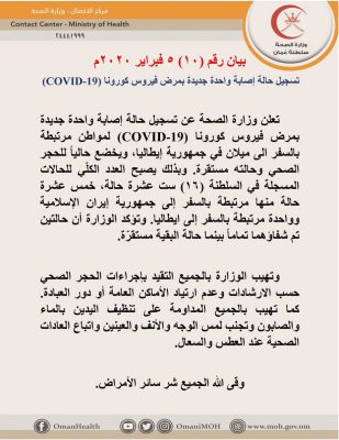 أعلنت وزارة الصحة عن تسجيل حالة إصابة واحدة جديدة بمرض فيروس كورونا ( 19 – COVID ) لمواطن مرتبطة بالسفر الى ميلان في جمهورية إيطاليا ، ويخضع حالياً للحجر الصحي وحالته مستقرة . وبذلك يصبح العدد الكلي للحالات المسجلة في السلطنة ست عشرة حالة.