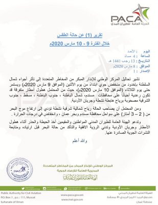 ‏⁧‫الهيئة العامة للطيران المدني‬⁩ تصدر التقرير رقم ١ عن حالة الطقس يومي ٩ و١٠ من شهر مارس الحالي وذلك حسبدالتفاصيل التالية: