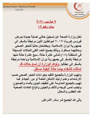 وزارة الصحة تعلن عن تسجيل حالتيين إصابة جديدة بمرض فيروس كورونا 2019 م مرتبطة بالسفر إلى الجمهورية الإسلامية الإيرانية، لتصبح عدد الحالات المسجلة في السلطنة 18 حالة.