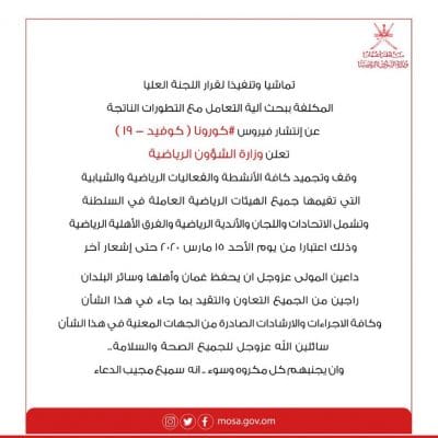 تماشيا وتنفيذا لقرار اللجنة العليا المكلفة ببحث آلية التعامل مع التطورات الناتجة عن إنتشار فيروس كورونا وزارة الشؤون الرياضية تعلن وقف وتجميد كافة الأنشطة والفعاليات الرياضية والشبابية، التي تقيمها جميع الهيئات الرياضية العاملة في السلطنة.