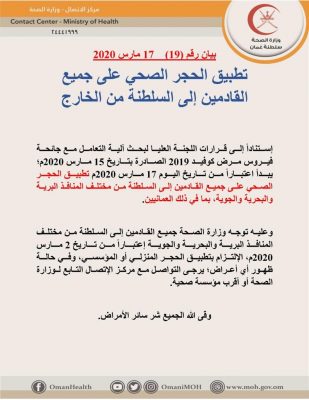 أصدر وزارة الصحة بيان رقم (١٩) لتطبيق الحجر الصحي على جميع القادمين إلى السلطنة من الخارج.