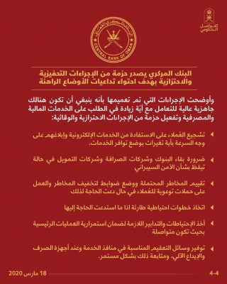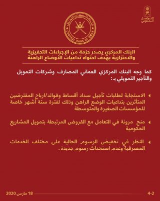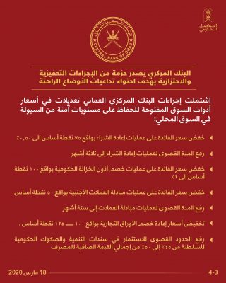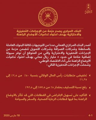 البنك المركزي العماني يطلق حزمة من الإجراءات التحفيزية والاحترازية في ظل الظروف الراهنة وذلك ضمن سلسلة من الحزم التي تعمل الحكومة على إطلاقها في هذه الفترة.