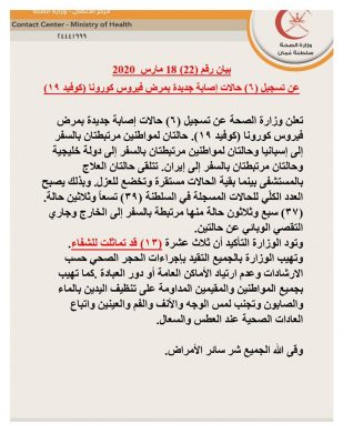 وهج الخليج-مسقط تعلن وزارة الصحة عن تسجيل (٦) حالات إصابة جديدة بمرض فيروس كورونا (كوفيد ١٩)