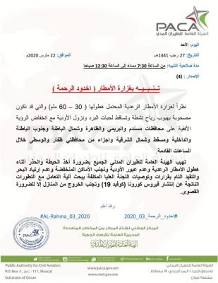وهج الخليج-مسقط أصدرت الهيئة العامة للطيران المدني تنبيه بغزارة الأمطار على المحافظات الشمالية ومحافظتي ظفار والوسطى خلال الساعات القادمة