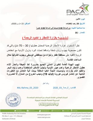وهج الخليج-مسقط أصدرت الهيئة العامة للطيران المدني تنبيه باستمرار غزارة الأمطار على محافظات ظفار والوسطى وجنوب الشرقية خلال الساعات القادمة.