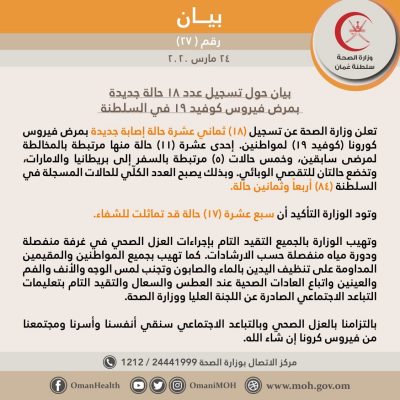تعلن وزارة الصحة عن تسجيل (١٨) ثمانية عشر حالة إصابة جديدة بمرض فيروس كورونا (كوفيد ١٩) لثمانية عشر مواطن. إحدى عشرة حالة منها مرتبطة بالمخالطة و خمسة حالات مرتبطة بالسفر وتخضع حالتان للتقصي الوبائي. وبذلك يصبح العدد الكلّي للحالات المسجلة في السلطنة (٨٤) أربعة وثمانون حالة.