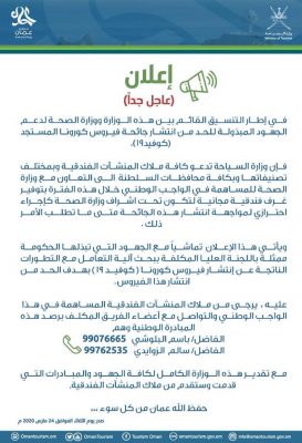 تدعو وزارة السياحة مُلاك المنشآت الفندقية بمختلف تصنيفاتها بكافة محافظات السلطنة للمساهمة في الواجب الوطني بتوفير غرف فندقية مجانية لتكون تحت إشراف وزارة الصحة كإجراء احترازي لمواجهة انتشار فيروس كورونا وذلك حسب التفاصيل التالية: