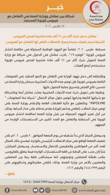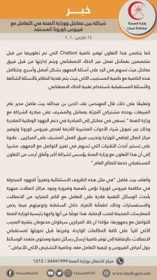 شركة “عمانتل” تدخل في شراكة مع وزارة الصحة للتعامل مع فيروس كورونا المستجد تتمثل في قيام الشركة بدعم شراء أكثر من 24 ألف مادة مختبرية لفحص الفيروس وتسخر تقنيات جديدة ومركز الاتصالات الخاص بها ، وذلك حسب التفاصيل التالية: