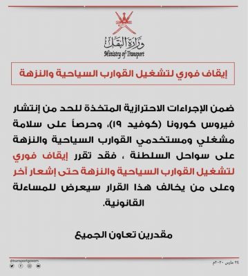 أصدرت وزارة النقل بياناً قضى بإيقاف فوري لتشغيل القوارب السياحية والنزهة حتى إشعار آخر، وذلك ضمن إجراءات الحد من انتشار كورونا وحرصا على سلامة مشغليها ومستخدميها. التفاصيل كالتالي: