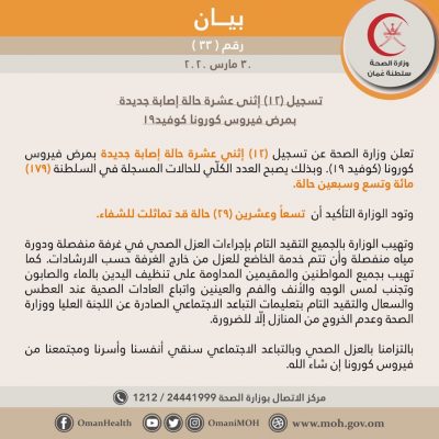 تعلن #وزارة_الصحة عن تسجيل (١٢) إثني عشرة حالة إصابة جديدة بمرض فيروس كورونا (كوفيد ١٩). وبذلك يصبح العدد الكلّي للحالات المسجلة في السلطنة (١٧٩) مائة وتسع وسبعين حالة.
