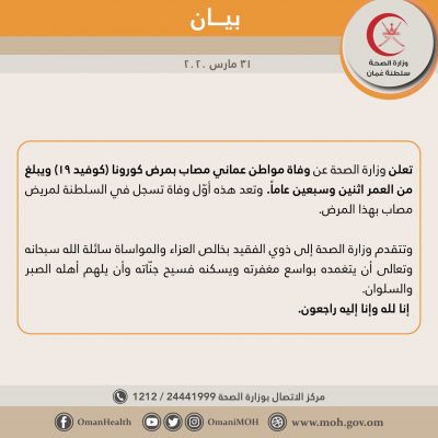 تعلن وزارة الصحة عن وفاة مواطن عماني مصاب بمرض كورونا ( كوفيد 19 ) ويبلغ من العمر اثنين وسبعين عاماً. وتعد هذه أوّل وفاة تسجل في السلطنة لمريض مصاب بهذا المرض.