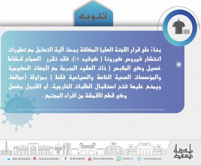 بلدية مسقط تُـنوه لقرار السماح بمزاولة نشاط “غسيل وكي الملابس” -في حال وجود التزامات وعقود مُـبرمة مع جهات حكومية وصحية وسياحية فقط – مع عدم السماح باستقبال طلبات غير التي حُـددت في هذا الاستثناء.