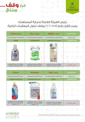 أصدر سعادة الدكتور سعيد بن خميس الكعبي رئيس الهيئة العامة لحماية المستهلك اليوم القرار رقم (105\2020) قضى في مادته الأولى بوقف تداول (9) تسعة أنواع من مُعقمات الأيدي وهي AMEYA -70ml، COSMO- 65ml، FEAH -50ml ، ZIVA -250ml ،SMSCOGEL DETER ، PIO PRO ، ANTISEPTIC ،DISENO.