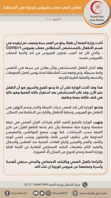أكدت وزارة الصحة عن تعافي طفل يبلغ من العمر سنة ونصف، تم ترقيده في قسم الأطفال بالمستشفى السلطاني مصاب بفيروس كورونا.