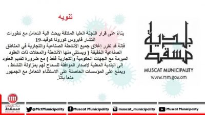 بلدية مسقط تصدر قرارا بإغلاق كافة الأنشطة الصناعية والتجارية بالمناطق الصناعية