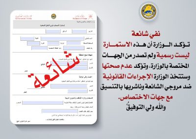 ذكرت وزارة الأوقاف والشؤون الدينية عبر حسابها الرسمي في تويتر أن هذه الاستمارة ليست رسمية ولم تصدر من الجهات المختصة بالوزارة، وأكدت عدم صحتها وأنها ستتتخذ الإجراءات القانونية ضد مروجي الشائعة وناشريها بالتنسيق مع جهات الاختصاص.