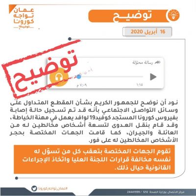 ذكر حساب عمان تواجه كورونا في تويتر بشأن المقطع المتداول ان تم تسجيل حالة إصابة بفيروس كورونا المستجد كوفيد١٩ لوافد يعمل في مهنة الخياطة وقد نقل العدوى ل٩ أشخاص من العائلة والجيران