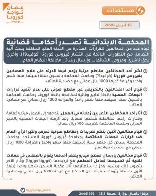 المحكمة الابتدائية تصدر أحكاما قضائية تجاه عدد من المخالفين للقرارات الصادرة عن اللجنة العليا المكلفة ببحث آلية التعامل مع التطورات الناتجة عن انتشار فيروس كورونا (كوفيد19)، وأخرى بحق ناشري ومروجي الشائعات وإرسال رسائل مخالفة النظام العام.