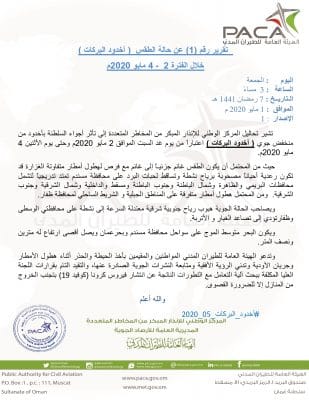 وهج الخليج-العمانية تشير الهيئة العامة للطيران المدني إلى تأثر أجواء السلطنة بأخدود من منخفض جوي أخدود البركات اعتبارا من يوم غد السبت الموافق 2 مايو وحتى يوم الأثنين 4 مايو.