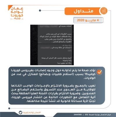 أكد حساب الرسمي لعمان أمانة عبر التويتر صحة ما يتم تداوله حول وجود إصابات بفيروس كورونا (كوفيد١٩) بسبب استلام طلبيات وبضائع للمنازل في عدد من الولايات.