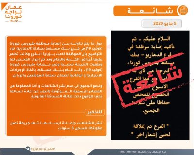ذكر حساب عمان تواجه كورونا عبر تويتر توضيح حول ما يتم تداوله عن إصابة موظفة بفيروس كورونا (كوفيد ١٩) في فرع بنك مسقط بصلالة (الدهاريز) غير صحيح، وندعو الجميع إلى عدم نشر الشائعات و أخذ المعلومة من المصادر الرسمية الموثوقة.