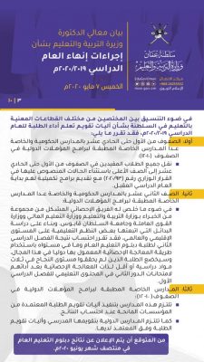 وقالت معالي الدكتورة وزيرة التربية والتعليم سيخض الطلبة الذين لم يحققوا مستوى النجاح في 3 مواد أو أقل لذات المعالجة الإحصائية بعد أدائهم لامتحانات الدور الثاني في المحتوى التعليمي للفصل الدراسي الأول من المتوقع الإعلان عن نتائج دبلوم التعليم العام في منتصف شهر يونيو المقبل.