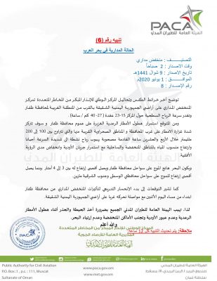 الهيئة العامة للطيران المدني تصدر التنبيه رقم( 6 ) حول الحالة المدارية في بحر العرب.