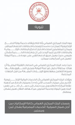 البنك المركزي العماني يصدر تنويه بإيقاف خدمة بوابة الدفع الإلكترونية
