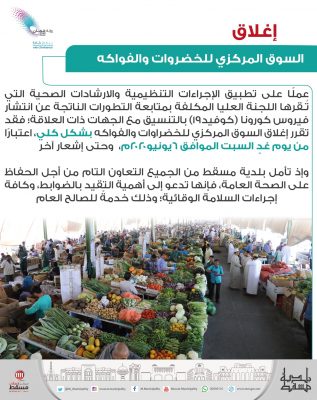 عملًا على تطبيق الإجراءات التنظيمية والارشادات الصحية التي تُـقرها اللجنة العليا المكلفة بمتابعة التطورات الناتجة عن انتشار فيروس #كورونا بالتنسيق مع الجهات ذات العلاقة تُعلن بلدية مسقط عن إغلاق كُلي للسوق المركزي للخضراوات والفواكه اعتبارًا من يوم غدٍ السبت وحتى إشعار آخر.