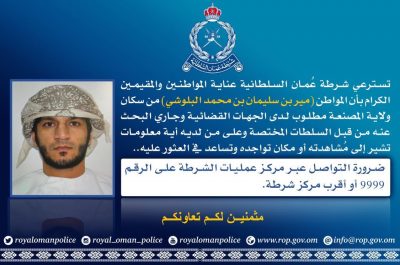 ذكرت شرطة عمان السلطانية بأنه جاري البحث عن المواطن الموضحة بياناته في المستند المُرفق والمطلوب لدى الجهات القضائية؛ فعلى من يجده أو يعثر على معلومات عنه التقدم فوراً لمركز عمليات الشرطة أو أقرب مركز شرطة.