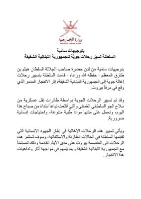 أصدر حضرة صاحب الجلالة السلطان هيثم بن طارق آل سعيد حفظه الله ورعاه توجيهاته السامية بتسيير رحلات جوية لإغاثة الجمهورية اللبنانية الشقيقة إثر الانفجار المدمر الذي وقع بمرفأ بيروت.