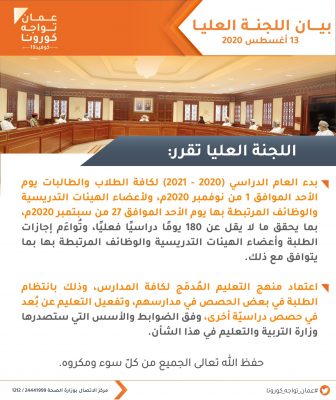 اللجنة العليا تقرر بدء العام الدراسي لكافة الطلاب والطالبات يوم الأحد 1 نوفمبر 2020م، ولأعضاء الهيئات التدريسية والوظائف المرتبطة بها يوم الأحد 27 سبتمبر 2020م، مع اعتماد منهج التعليم المُدمَج لكافة المدارس.