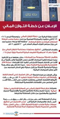 أعلنت وزارة المالية اليوم عن خطة التوازن المالي ( ٢٠٢٠ – ٢٠٢٤ ) وتتضمن 5 محاور وهي كالآتي :