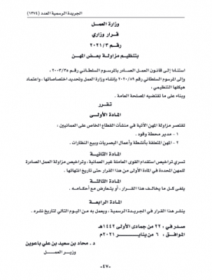 وهج الخليج-مسقط أصدر معالي الدكتور محاد بن سعيد بن علي باعوين قرارًا وزاري رقم ۲۰۲۱/۳ بتنظيم مزاولة بعض المهن