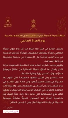 وهج الخليج-مسقط السيدة الجليلة حرم جلالة السلطان المعظم /حفظها الله ورعاها/ توجه كلمة بمناسبة يوم المرأة العالمي.