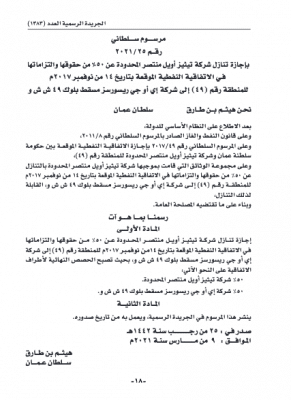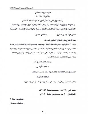 أصدر حضرة صاحب الجلالة السلطان هيثم بن طارق المعظم – حفظه الله ورعاه مرسومين سلطانيين ساميين ، قضي الأول بالتصديق على اتفاقية بين حكومة سلطنة عمان وحكومة جمهورية سريلانكا حول الإعفاء من متطلبات التأشيرة لحاملي جوزات السفر الدبلوماسية والخاصة والخدمة والرسمية