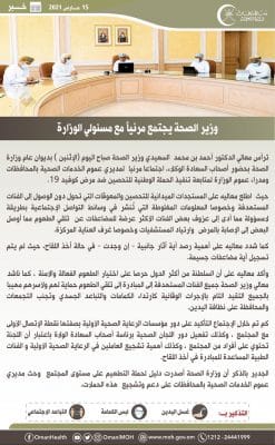 ترأس معالي الدكتور أحمد بن محمد السعيدي وزير الصحة صباح اليوم (الإثنين ) بديوان عام وزارة الصحة بحضور أصحاب السعادة الوكلاء، اجتماعا مرئيا لمديري عموم الخدمات الصحية بالمحافظات ومدراء عموم الوزارة لمتابعة تنفيذ الحملة الوطنية للتحصين ضد مرض كوفيد 19 .