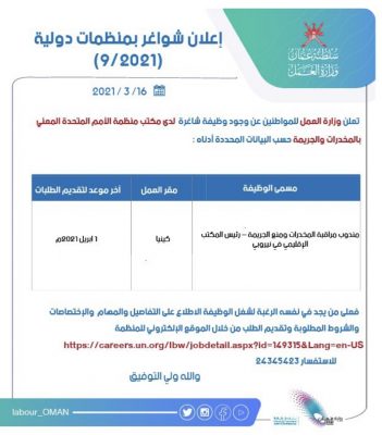 تعلن وزارة العمل عن وجود وظيفة شاغرة لدى مكتب منظمة الأمم المتحدة المعني بالمخدرات و الجريمة .