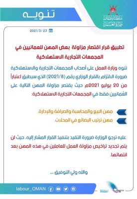 تنوه وزارة العمل على أصحاب المجمعات التجارية والاستهلاكية ضرورة الالتزام بالقرار الوزاري رقم(2021/8) الذي سيطبق اعتباراً من 20 يوليو 2021م حيث يقتصر مزاولة المهن التالية على العمانيين فقط في المجمعات التجارية الاستهلاكية.