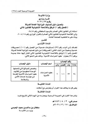 وهج الخليج- مسقط أصدر وزير المالية قرارًا بتعديل دليل تصنيف الميزانية العامة للدولة ( الملحق رقم ١ ) المرفق باللائحة التنفيذية للقانون المالي، وجاء القرار الذي نشرته الجريدة الرسمية كالآتي: