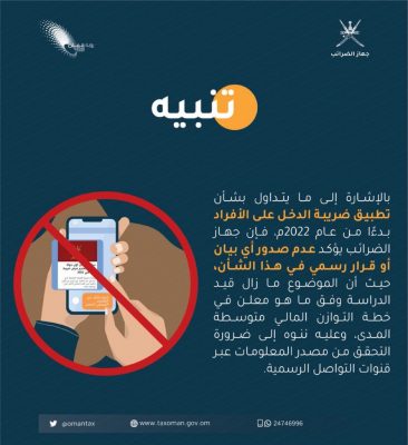 وهج الخليج- مسقط لا صحة لما يتداول عبر وسائل التواصل الاجتماعي حول تطبيق ضريبة الدخل للأفراد.