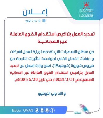 تعلن الوزارة عن تمديد فترة العمل بتراخيص استقدام القوى العاملة غير العمانية المنتهية خلال الفترة من ٣١/ ٣ / ٢٠٢١م وحتى ٣٠ / ٦/ ٢٠٢١م .