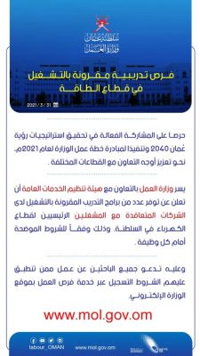 أعلنت وزارة العمل بالتعاون مع هيئة تنظيم الخدمات العامة عن توفر عدد من برامج التدريب المقرونة بالتشغيل لدى الشركات المتعاقدة مع المشغلين الرئيسيين لقطاع الكهرباء في السلطنة للاطلاع والتسجيل عبر موقع الوزارة الإلكتروني: