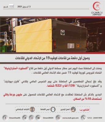أعلنت وزارة الصحة عن ‏وصول أول دفعة من لقاح ⁧‫أكسفورد أسترازينيكا‬⁩ المُضاد لفيروس كورونا ⁧‫كوفيد١٩‬⁩ ضمن العقد المُبرم مع الاتحاد العالمي للقاحات.