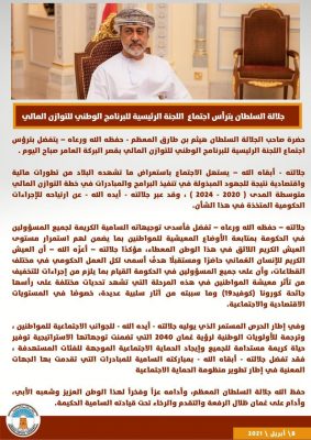 حضرة صاحب الجلالة السلطان هيثم بن طارق المعظم – حفظه الله ورعاه – يتفضل بترؤس اجتماع اللجنة الرئيسية للبرنامج الوطني للتوازن المالي في قصر البركة العامر صباح اليوم.