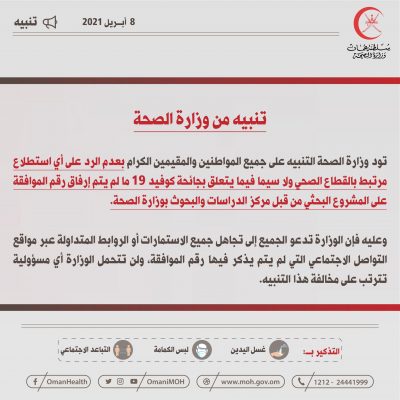 وهج الخليج- مسقط نشرت الصحة تنبيهاً لجميع المواطنين والمقيمين الكرام بعدم الرد على أي استطلاع مرتبط بالقطاع الصحي ما لم يتم إرفاق رقم الموافقة على المشروع البحثي من قبل مركز الدراسات والبحوث بالوزارة. التفاصيل: